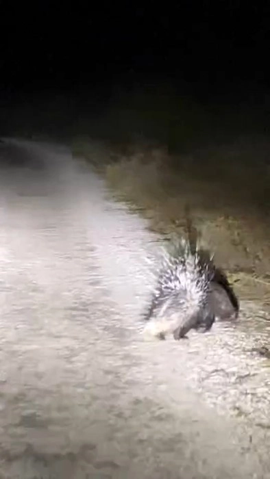 Afrika’da yaşadığı bilinen ve nadiren Türkiye’de de görülen oklu kirpi, Koruk köyünde bir sürücü tarafından görüntülendi. Köy yolunda görüntülenen oklu kirpi daha sonra gözden kaybolurken, o anlar sürücü tarafından cep telefonu kamerası ile kayıt altına alındı.