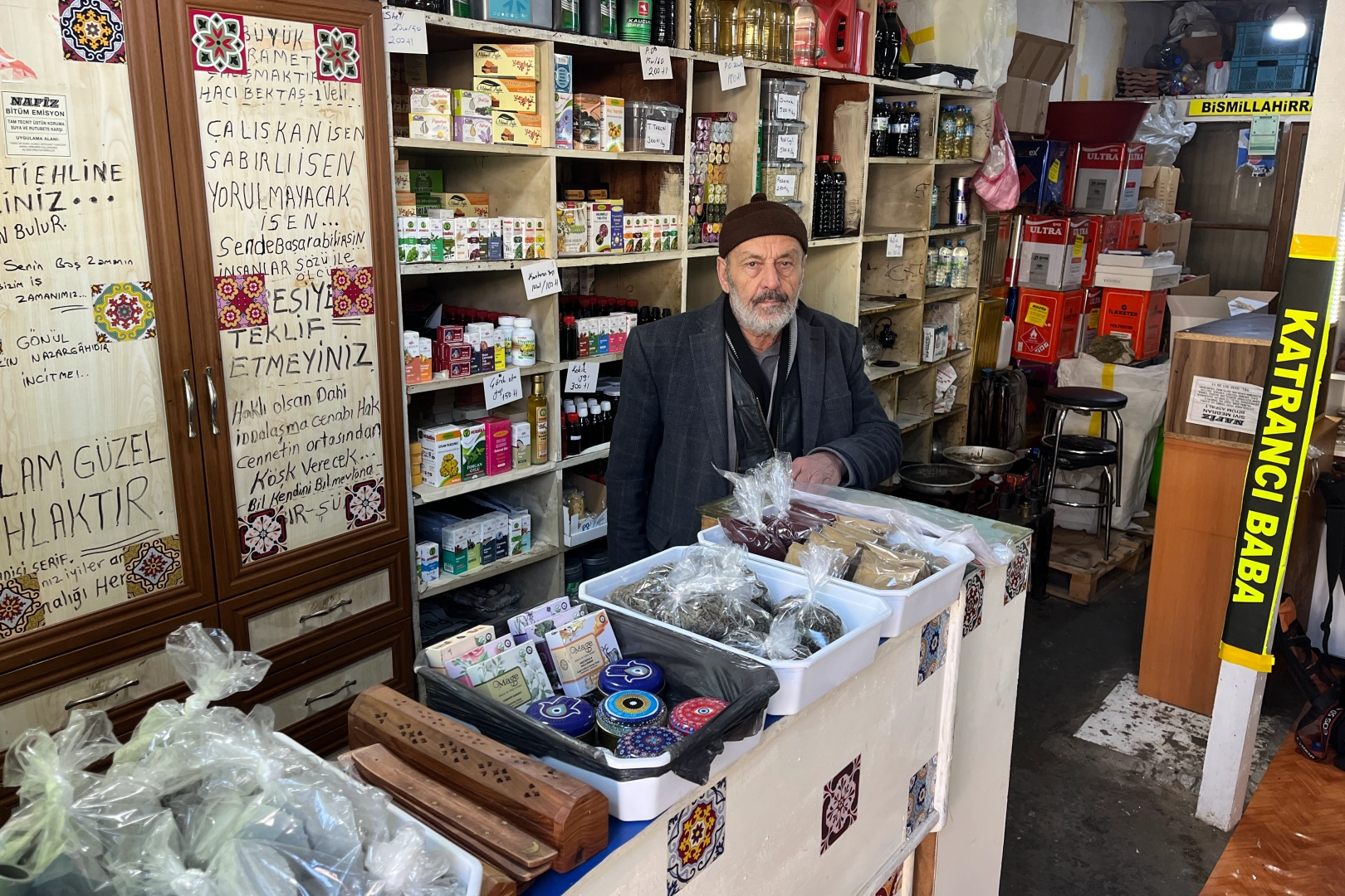 Katrancılığı devam ettirdiğini anlatan esnaf Nafiz Ünalacak, "Rahatsızlanınca ameliyat geçirdiğim için mahdum Tevfik Ünalacak'a devrettim, o yürütüyor. Ben burada fahri olarak ona yardımcı oluyorum. Öyle devam ediyoruz. Aşağı yukarı 15 yaşında başladık. Dükkanı kapatmamak için oğluma devrettim. İşe devam ediyor. Katran, zift, makineye vesaire satardık. Şimdi biraz baharat, sedir katranı, onlara da devam etmeye başladık. İnsanlara faydalı olsun diye. Katranlar çeşitli... Hayvanlara kullanılan katranlar var. Koyun, kuzu, inek, dana, şap hastalığına kullanılıyor. Sonradan da insanlar için de sedir katranı olarak tavsiye ediyoruz. Akciğere, nefes darlığına, iç hastalıklarına faydalı bir şey. Kullanımı su bardağına bir iki damla damlatarak içilebiliyor. Faydasını da görenler birbirine tavsiye edip geliyor. Eskiden satıyorduk. Lastik sanayinde kullanılıyordu. Lastik fabrikaları zaman aşımında teknoloji ilerlediği için ayakkabıya döndü. Eskiden lastik ayakkabı kullanılıyordu, katranlar hamur içine giriyordu madde olarak. Fabrikaların çoğu kapattı. Yani teknoloji yürümedi. Yeni yeni ayakkabılara kullanmaya başladılar. Sonra hayvancılıkta kullanılıyor. Hayvan hastalıklarına, yarasına, beresine o şekil devam ediyor" dedi.