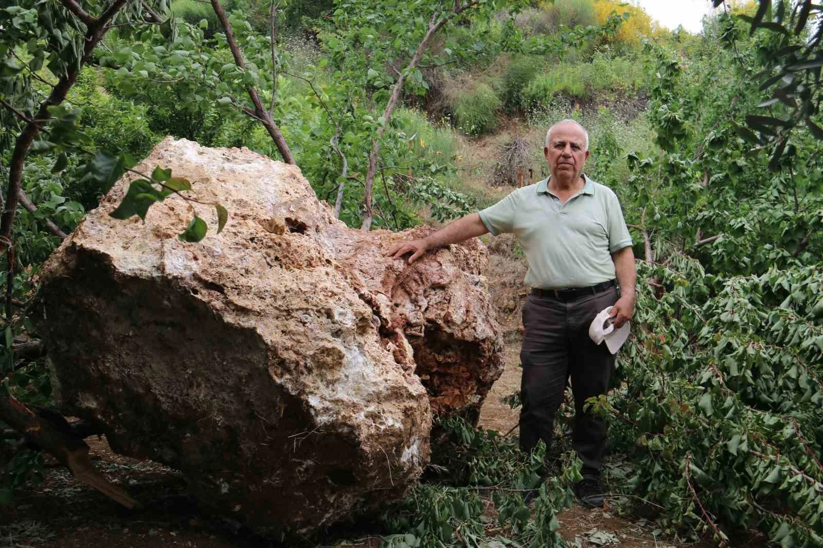 10 ton kaya parçasının bahçesine düştüğünü ifade eden Selahattin Altınöz, “Biz burada kayısı toplamaya geldik. Birdenbire uçarak üstümüze geldi. Nereden geldiğini biliyoruz ama ne zaman geleceğini kimse bilmiyor. Çünkü yukarıda taş ocağı var. Ben mimarım ve teknik şeyleri anlarım. Aşağı yukarı bu taş 4 metreküp. 4 metreküp bir taşın özgül ağırlığı 2,5 ton metreküp bu da 10 ton civarında. Tabii ki korktuk ben o anda burada değildim ama bizimkiler kaçıştılar. Hatta bir kova kayısı vardı dökülmüştü. Bu yeniydi ama 10-15 gün önce komşumuzun bahçesinde aynı şey oldu. Komşumun orada evi yok. Ev olmadığı için sadece ağaçlara zarar verildi” dedi.