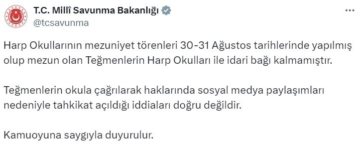 Milli Savunma Bakanlığı (MSB), Harp Okullarının mezuniyet törenleri sonrası ortaya atılan iddialara ilişkin, “Teğmenlerin okula çağrılarak haklarında sosyal medya paylaşımları nedeniyle tahkikat açıldığı iddiaları doğru değildir” açıklamasında bulundu.