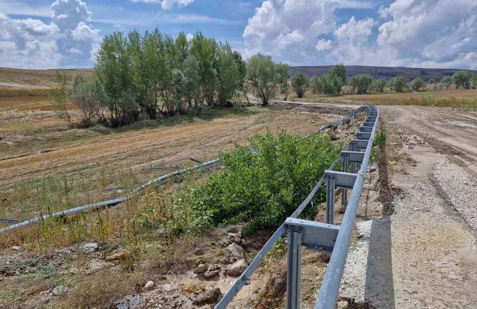 Çorum’un Alaca ilçesinde dün gece etkili olan yağış sonrası oluşan sel yol kenarlarındaki bariyerleri söktü.