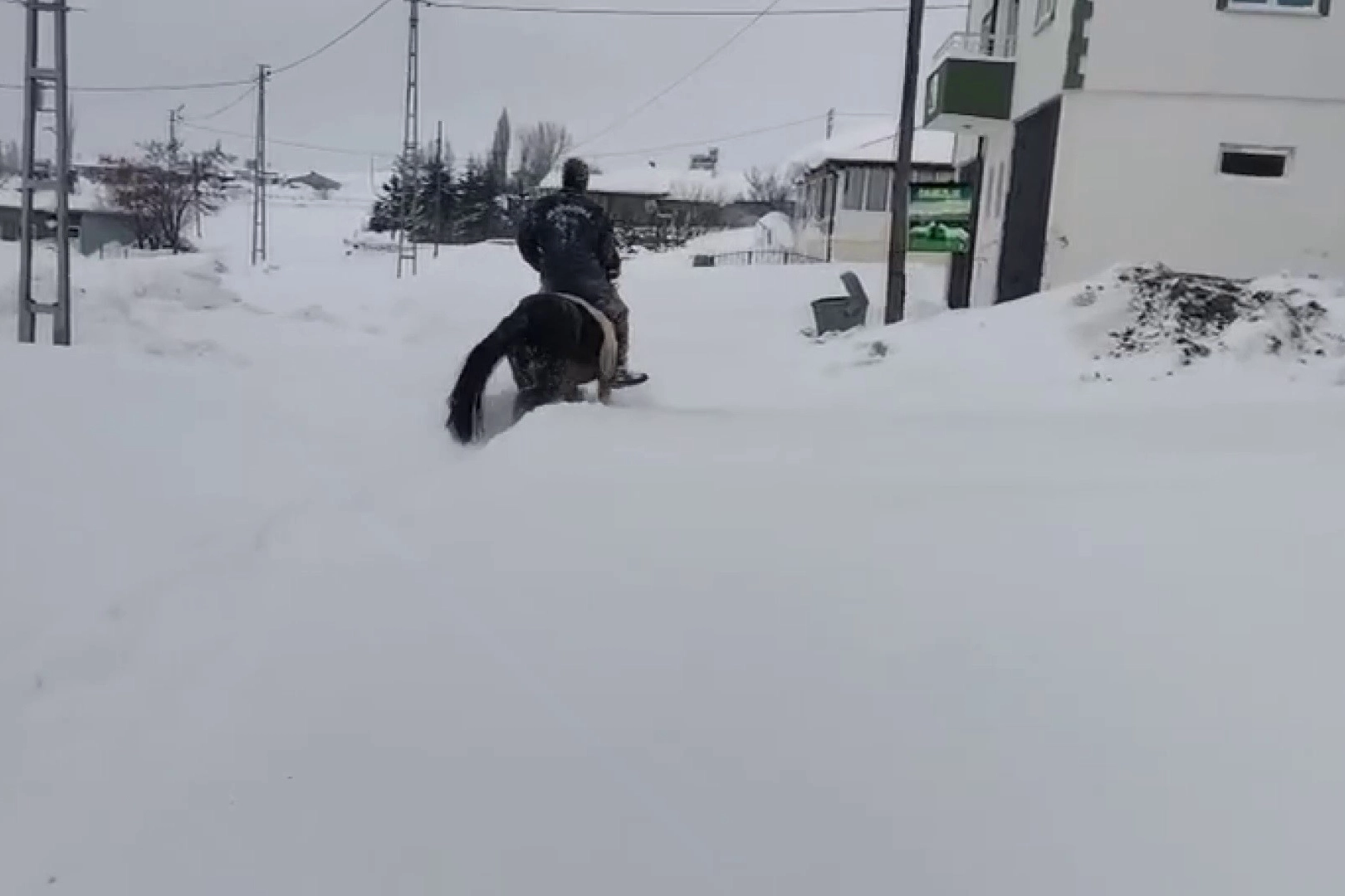 Sivas'ta günlerdir devam eden kar yağışı nedeniyle şehir merkezinde kar kalınlığı 40 santimetreyi bulurken yer yer kar kalınlığı 2 metreyi aştı. Yağan kardan en çok etkilenen hayvancılık yapanlar oldu. Sivas'ın Altınyayla ilçesi Altınyurt Mahallesi’nde yaşayan Ruşan Atalay, karla kaplanan köyde yollar araç ulaşamına kapandığından ağılına ulaşmak için ata binmek zorunda kaldı. Atalay, atla ulaşabildiği ağıldaki küçükbaş hayvanları dışarı çıkardı. Zorlu şartlar altında hayvanlarını yemleyen Atalay, o anları cep telefonuyla görüntüledi.