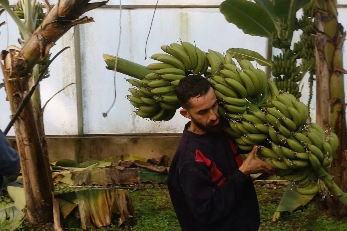 Aydın’ın Efeler ilçesine bağlı Dalama Mahallesi’nde muz hasadı gerçekleştirildi. Efeler İlçe Tarım ve Orman Müdürlüğü'nün de katıldığı hasat programında, üretici Hakan Özer’in muz bahçesi ziyaret edildi. Yaklaşık 5 yıldır 4 dekar alanda muz yetiştiriciliği yapan Hakan Özer’in bahçesinde 700 adet muz ağacı bulunurken, Özer normal şartlarda sezonda 26-27 ton civarında muz üretimi gerçekleştiriyor. Hasada katılan Efeler İlçe Tarım ve Orman Müdürü Mehmet Esen de üreticiyle birlikte muzları hasat ederken, bereketli bir yıl temennisinde bulundu.