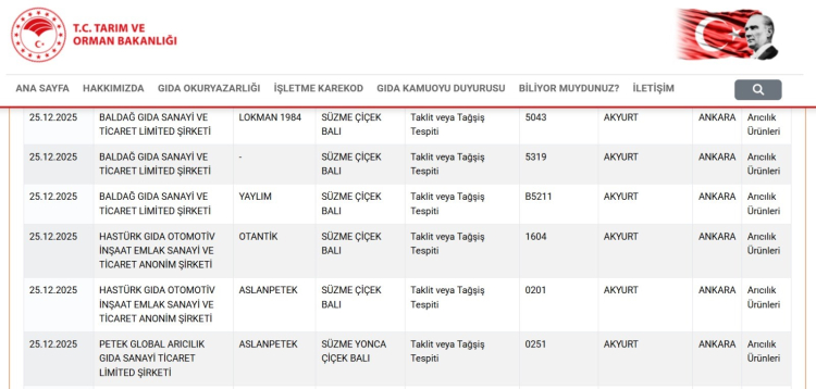 Bakanlığın 25 Aralık tarihli listesine göre; Baldağ Gıda Sanayi ve Ticaret Limited Şirketi'ne ait 'Lokman 1984 Süzme Çiçek Balı', markasız 'Süzme Çiçek Balı' ve 'Yaylım Süzme Çiçek Balı' ürünlerinde taklit veya tağşiş belirlendi.